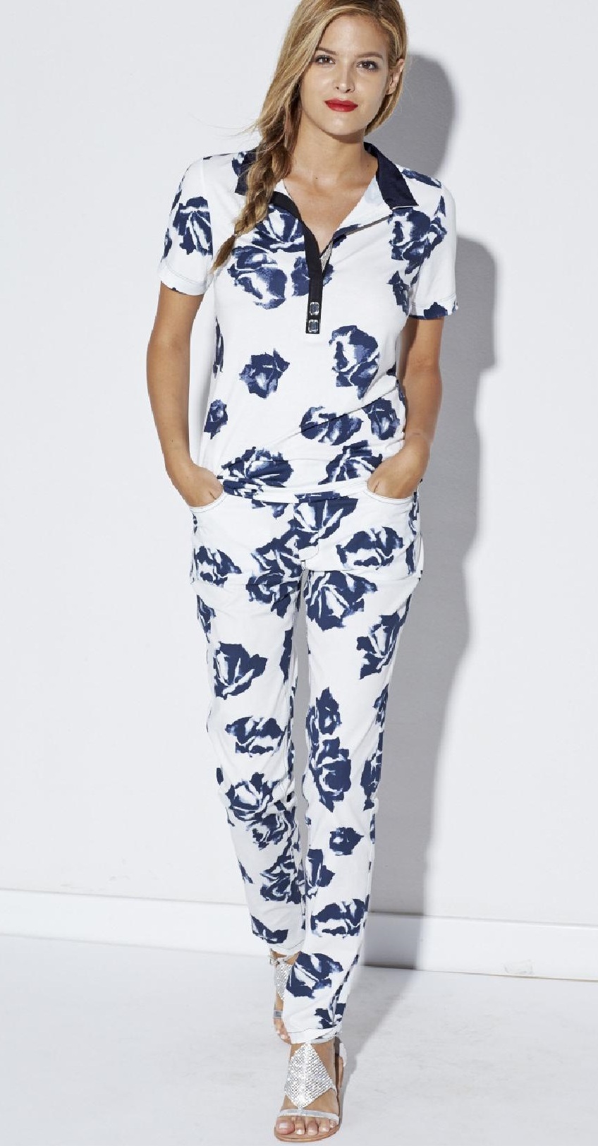 Укороченные хлопковые брюки с принтом синими розами на высокой посадке, тонкие и комфортные.