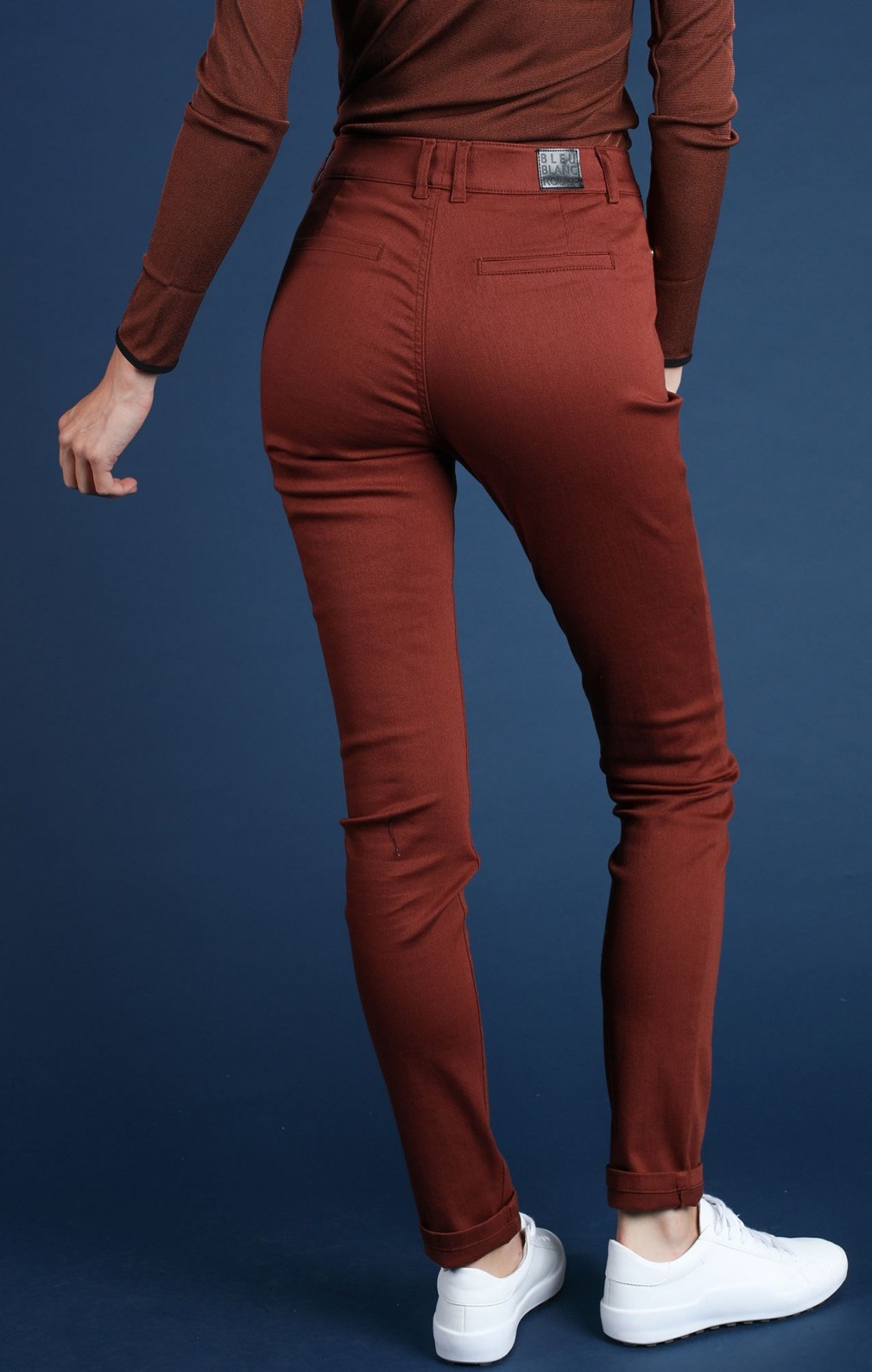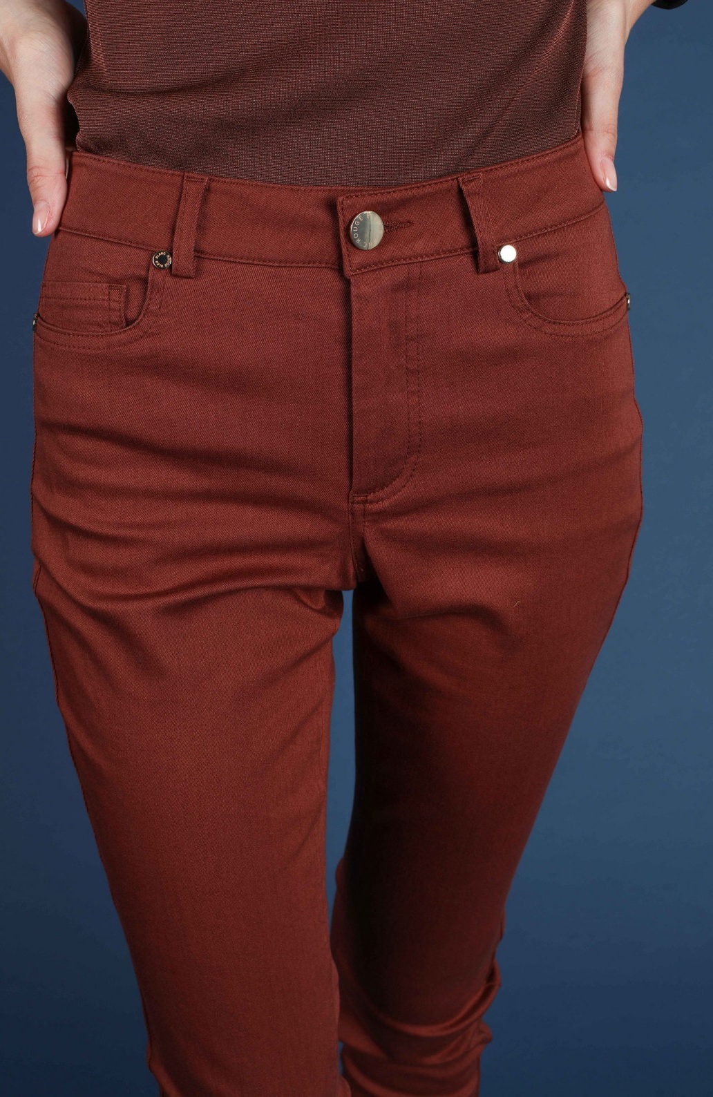 Зауженные базовые джинсы терракотового оттенка на высокой посадке.