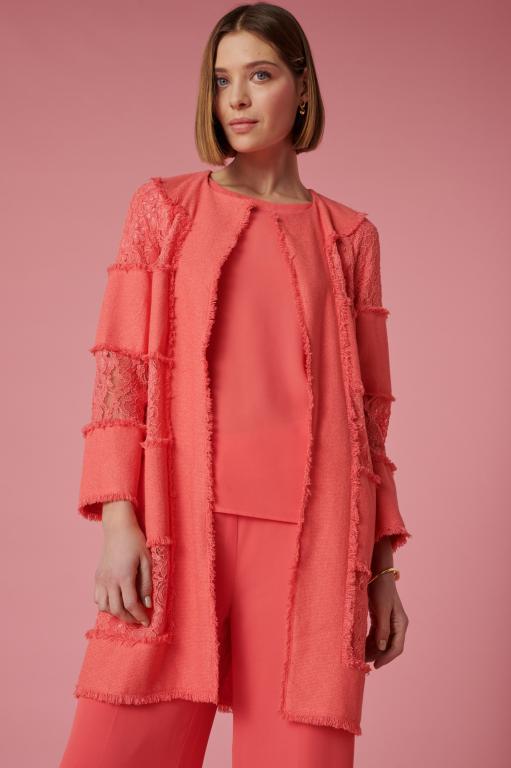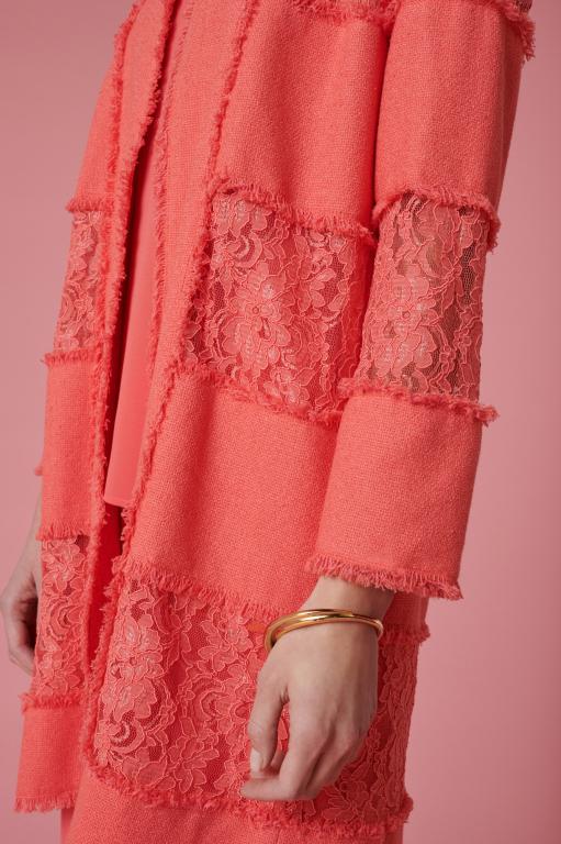 Легкое дизайнерское вечернее пальто из хлокового кружева кораллового цвета, безупречная фактура