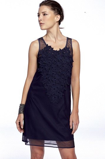 Коктейльное дизайнерское мини-платье глубокого синего цвета, расшитое впереди кружевными цветами
