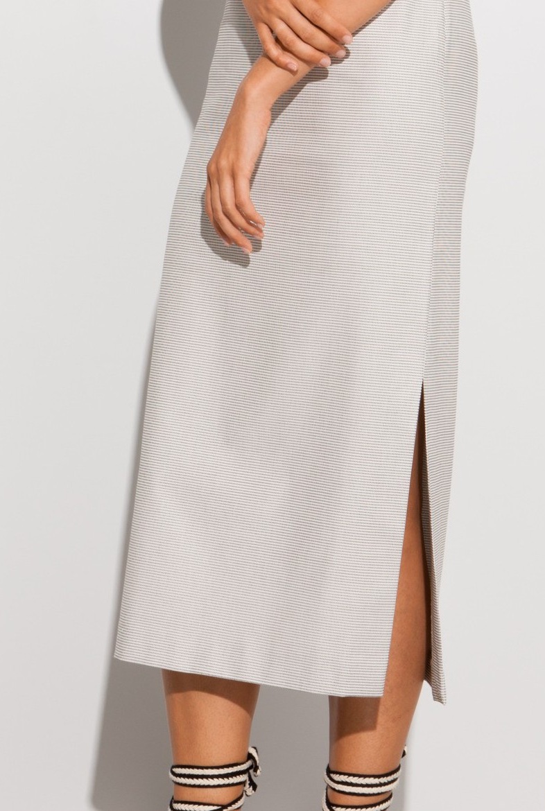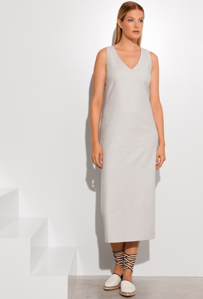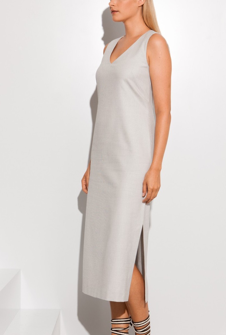 Прямое базовое платье светло-серого тона с разрезом, на молнии сзади