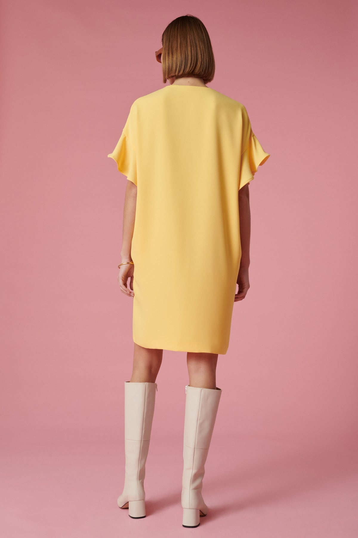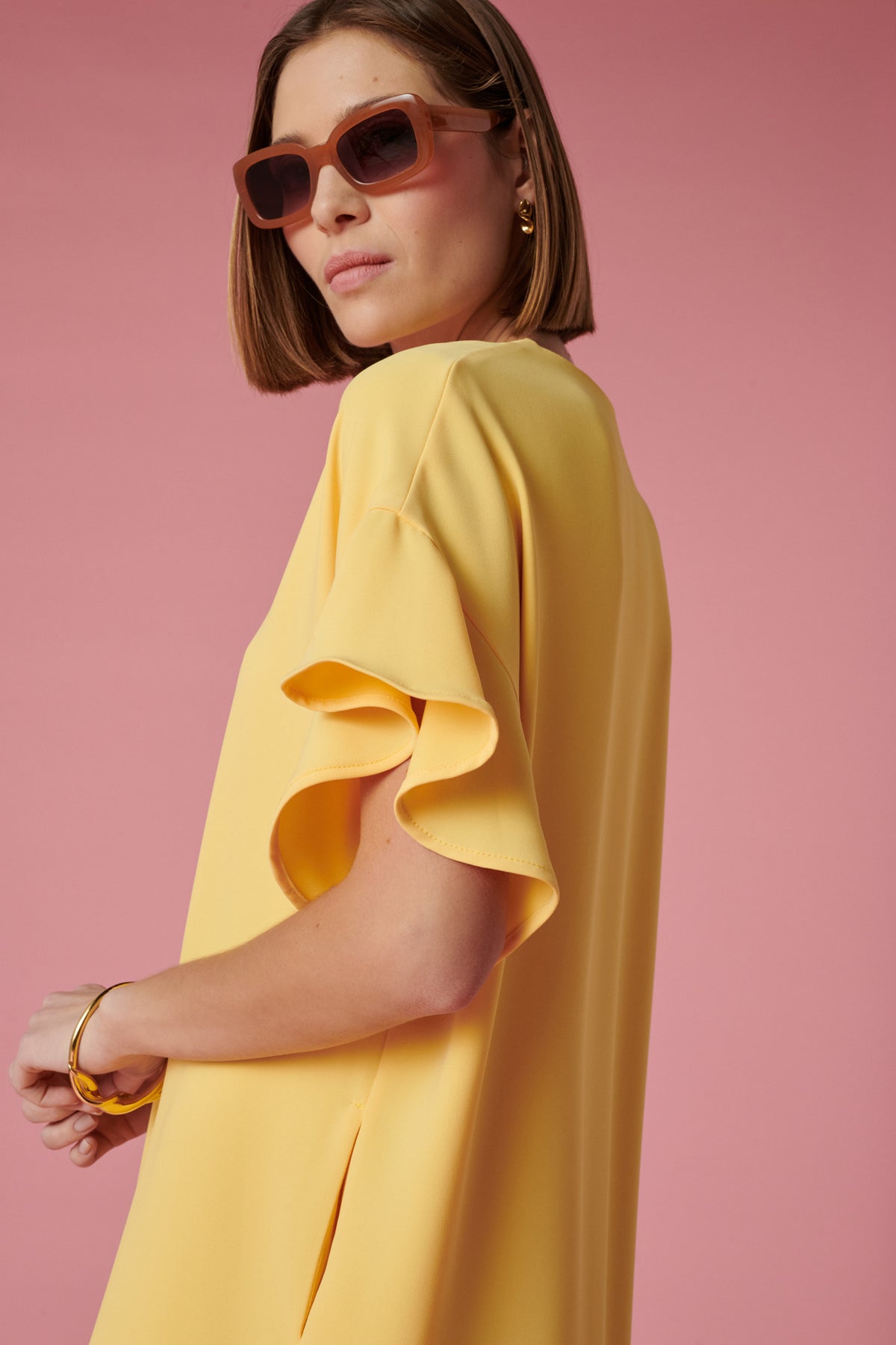 Яркое желтое платье с романтическими воланами по рукавам