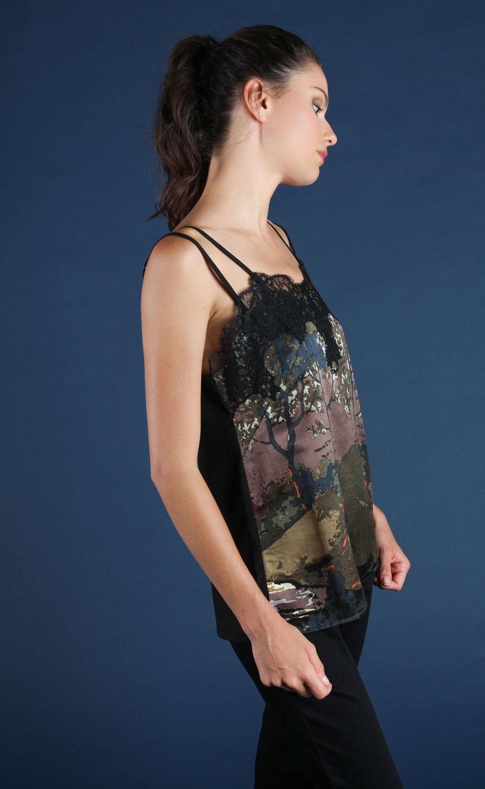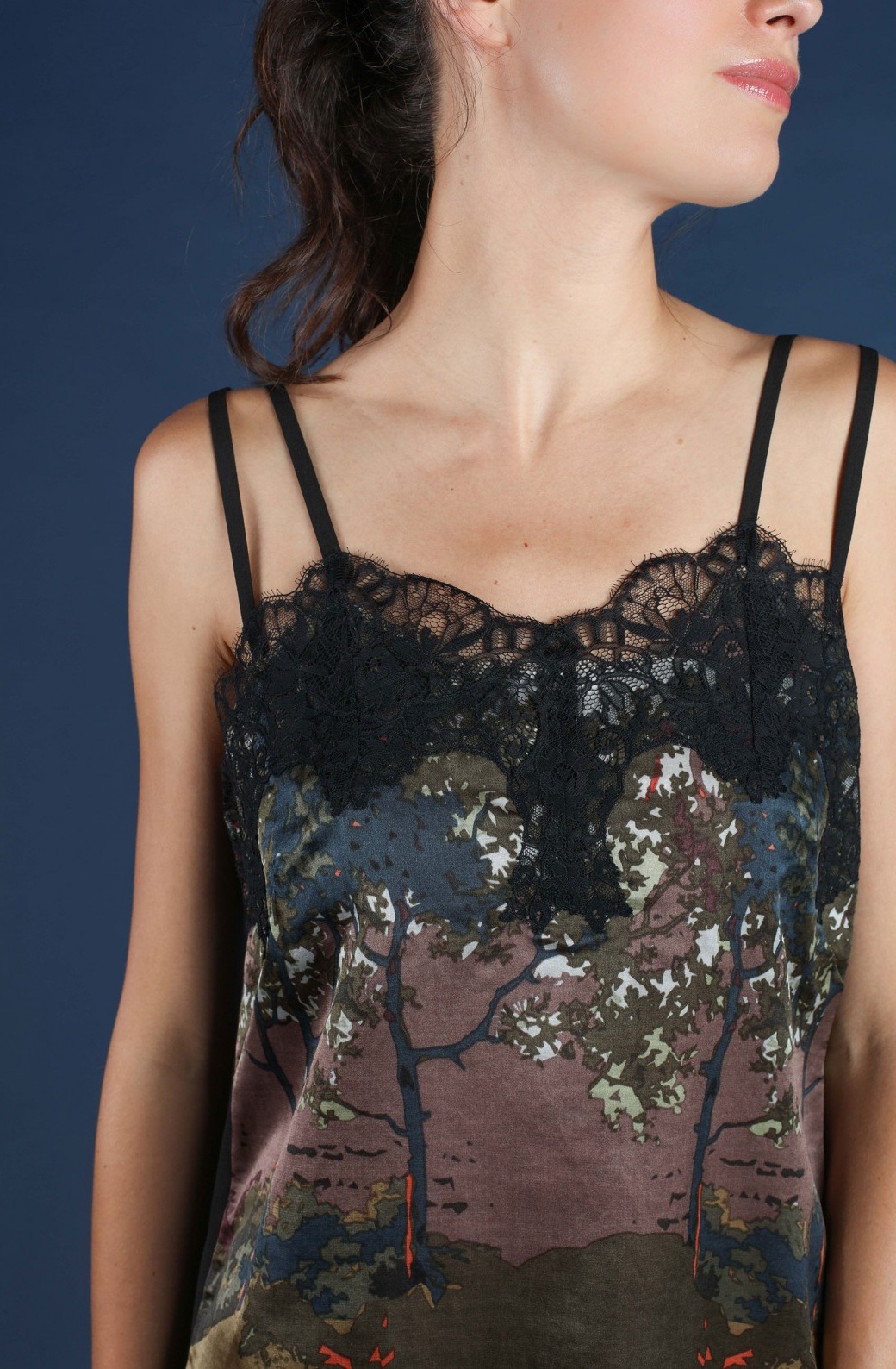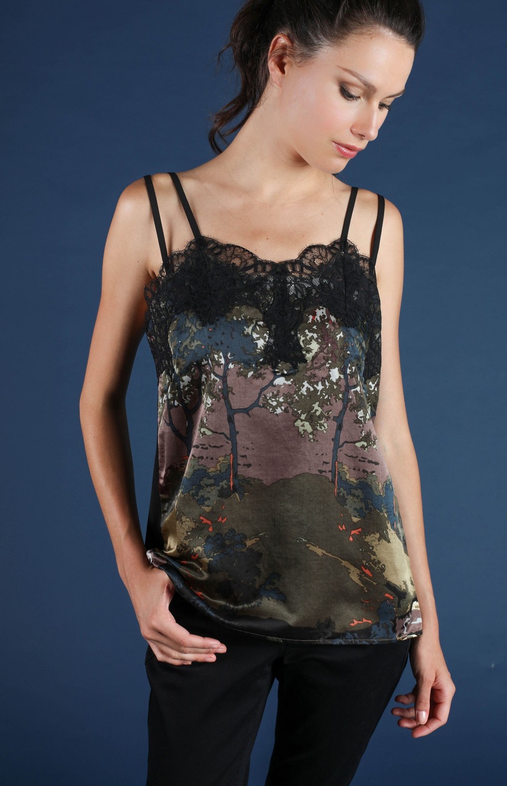 Шелковый атласный топ на бретелях с кружевной отделкой.