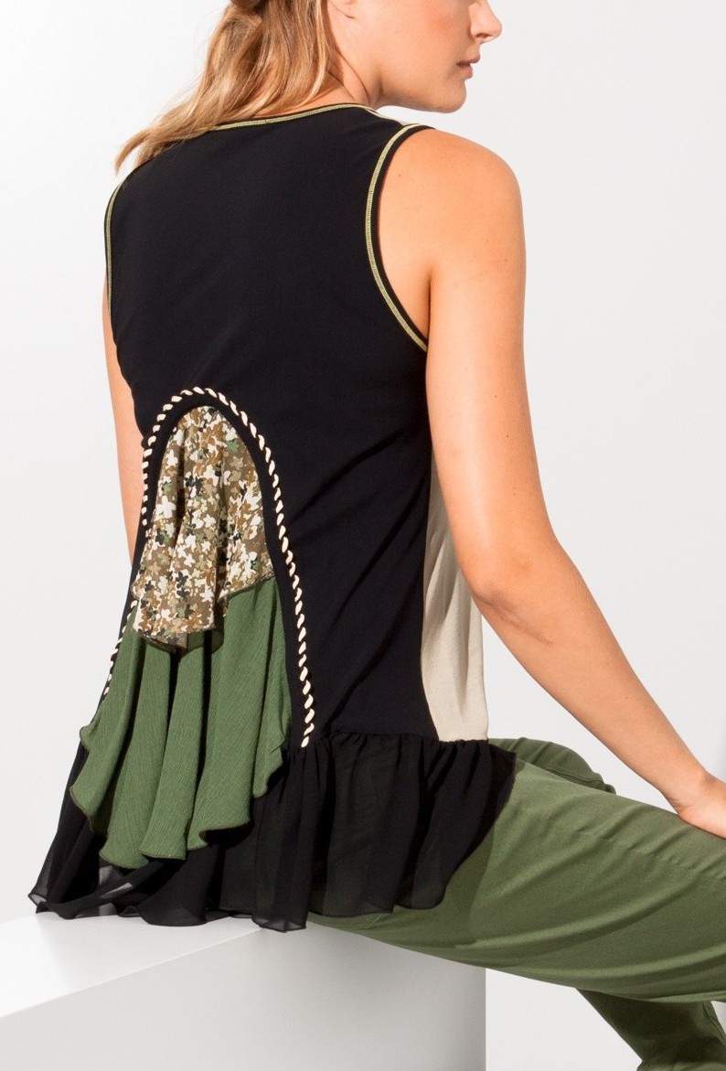 Топ однотонно-бежевый впереди с отделкой воланами и "хвостиком" сзади, не прилегающего свободного удлиненного силуэта.