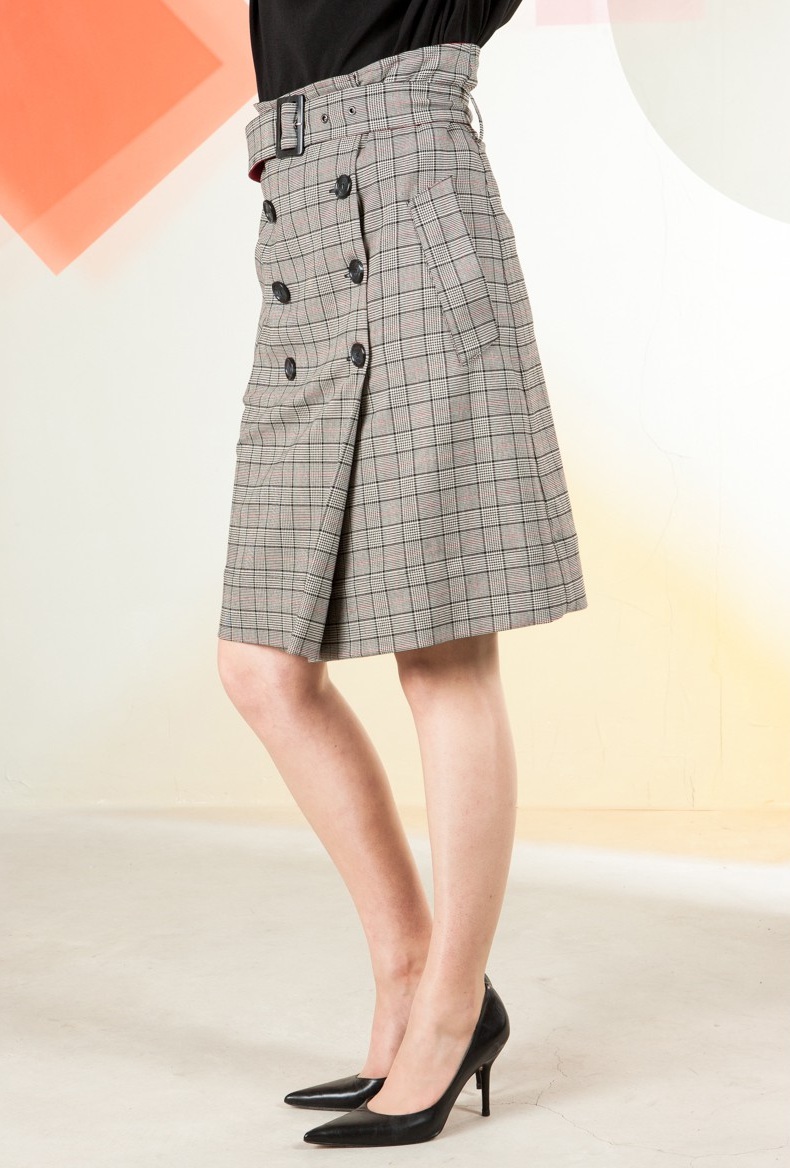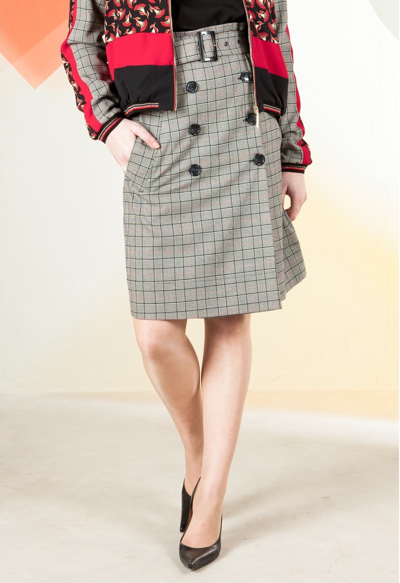 Двубортная юбка на высокой талии с поясом; два ряда пуговиц в качестве застежки.